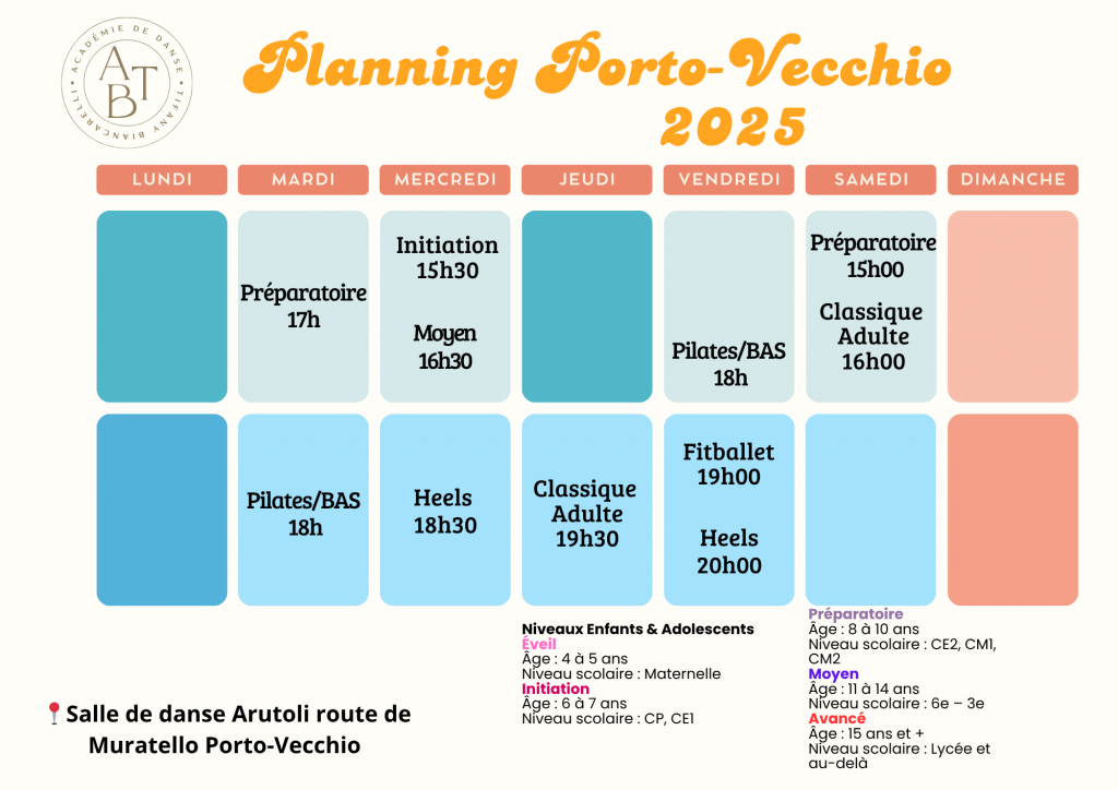 Explorez notre planning détaillé des cours pour enfants, adolescents et adultes, pour enrichir votre pratique de la danse et du bien être à Porto-Vecchio et Bonifacio.